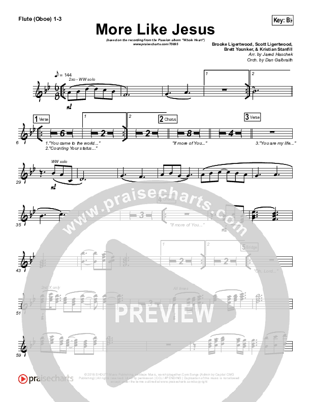 Download the Flute/Oboe sheet music for More Like Jesus by Passion / Kristian Stanfill, from the album Whole Heart. This song was arranged by Jared Haschek / Daniel Galbraith in the key of Bb, C.