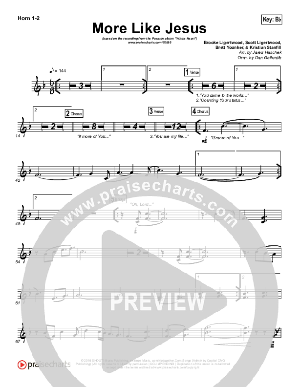 Download the French Horn sheet music for More Like Jesus by Passion / Kristian Stanfill, from the album Whole Heart. This song was arranged by Jared Haschek / Daniel Galbraith in the key of Bb, C.