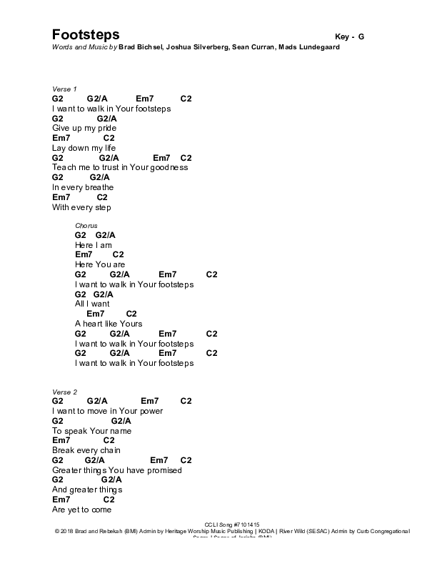 Download the PDF Chord Charts for Footsteps by Brad & Rebekah, from the album Sound Of Heaven.