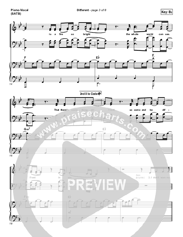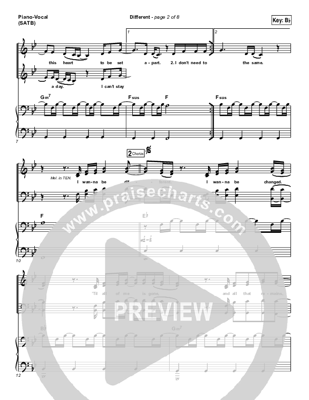 Download the sheet music for Different by Micah Tyler, from the album Different. This song was arranged by Dustin Loehrs / Daniel Galbraith in the key of A, Bb.