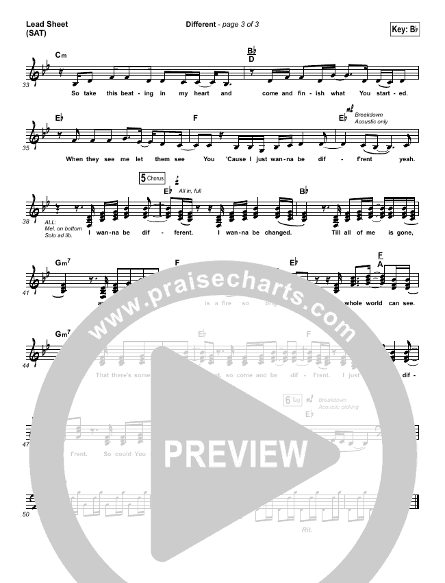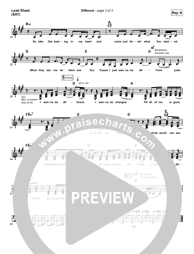 Download the sheet music for Different by Micah Tyler, from the album Different. This song was arranged by Dustin Loehrs / Daniel Galbraith in the key of A, Bb.