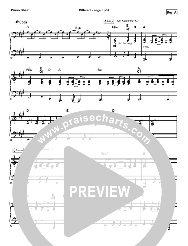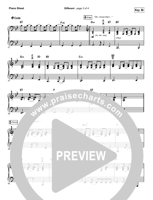 Download the piano sheet for Different by Micah Tyler, from the album Different. This song was arranged by Dustin Loehrs / Daniel Galbraith in the key of A, Bb.
