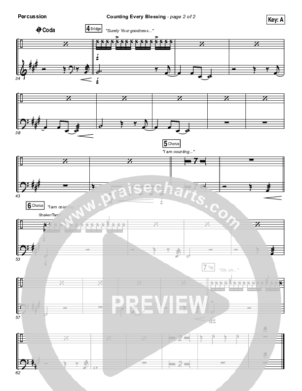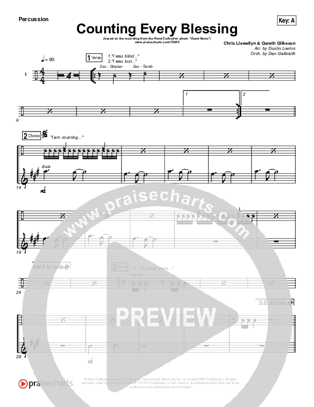 Download the percussion sheet music for Counting Every Blessing by Rend Collective, from the album Good News. This song was arranged by Dustin Loehrs / Daniel Galbraith in the key of A, Ab, G.