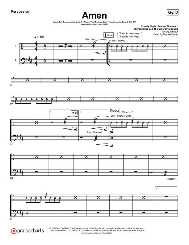 Download the percussion sheet music for Amen by People & Songs / Charity Gayle / Joshua Sherman, from the album The Emerging Sound Vol 3. This song was arranged by Ed Kerr / Daniel Galbraith in the key of D, Eb.