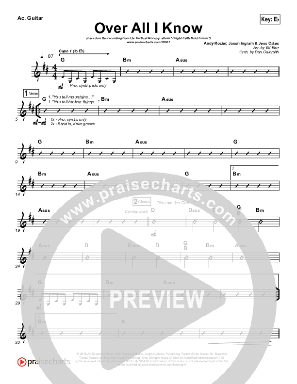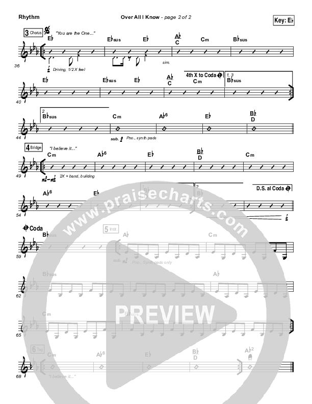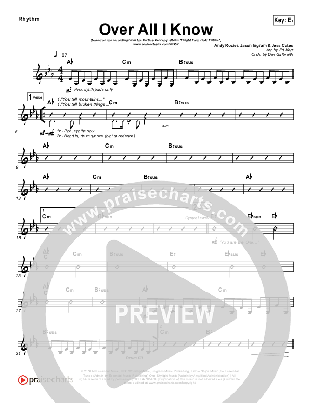 Download the Rhythm Chart for Over All I Know by Vertical Worship, from the album Bright Faith Bold Future. This song was arranged by Ed Kerr / Daniel Galbraith in the key of E, Eb.
