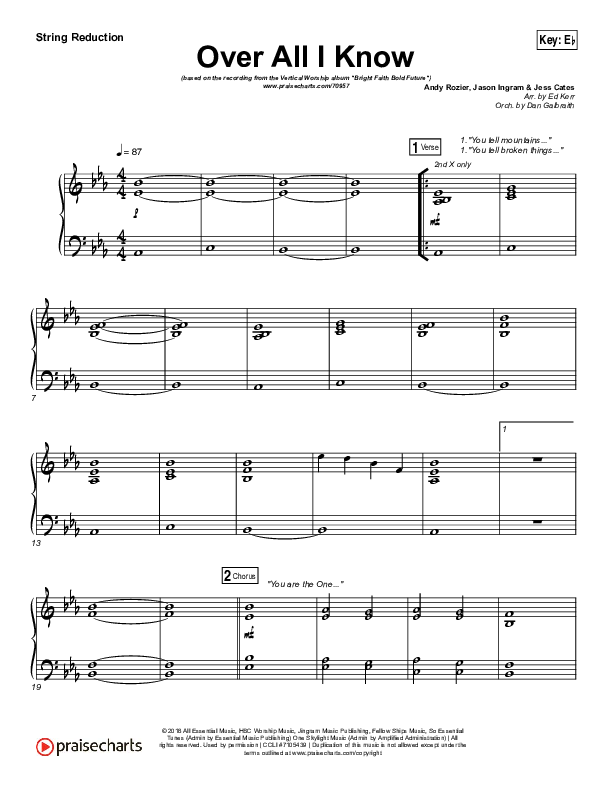 Download the Orchestration string parts for Over All I Know by Vertical Worship, from the album Bright Faith Bold Future. This song was arranged by Ed Kerr / Daniel Galbraith in the key of E, Eb.
