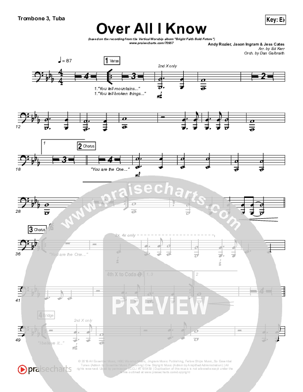 Download the Trombone 3/Tuba sheet music for Over All I Know by Vertical Worship, from the album Bright Faith Bold Future. This song was arranged by Ed Kerr / Daniel Galbraith in the key of E, Eb.