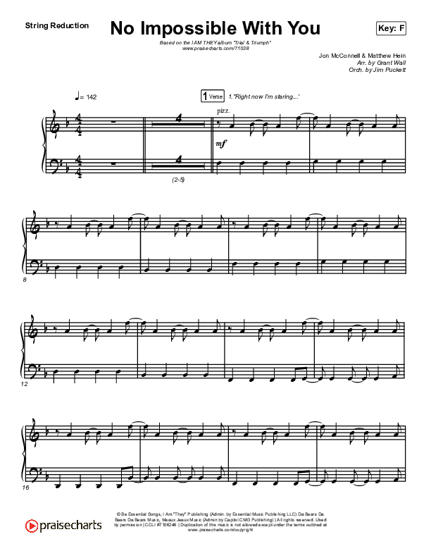 Download the String Reduction sheet music for No Impossible With You by I Am They, from the album Trial & Triumph. This song was arranged by Grant Wall / Jim Puckett in the key of E, Eb, F.