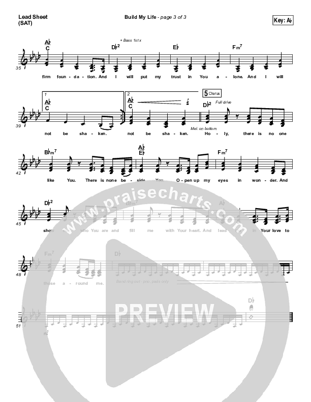 Download the sheet music for Build My Life by Pat Barrett, from the album Pat Barrett. This song was arranged by Dave Iula / Daniel Galbraith in the key of Ab, D, E, Eb, F, G.