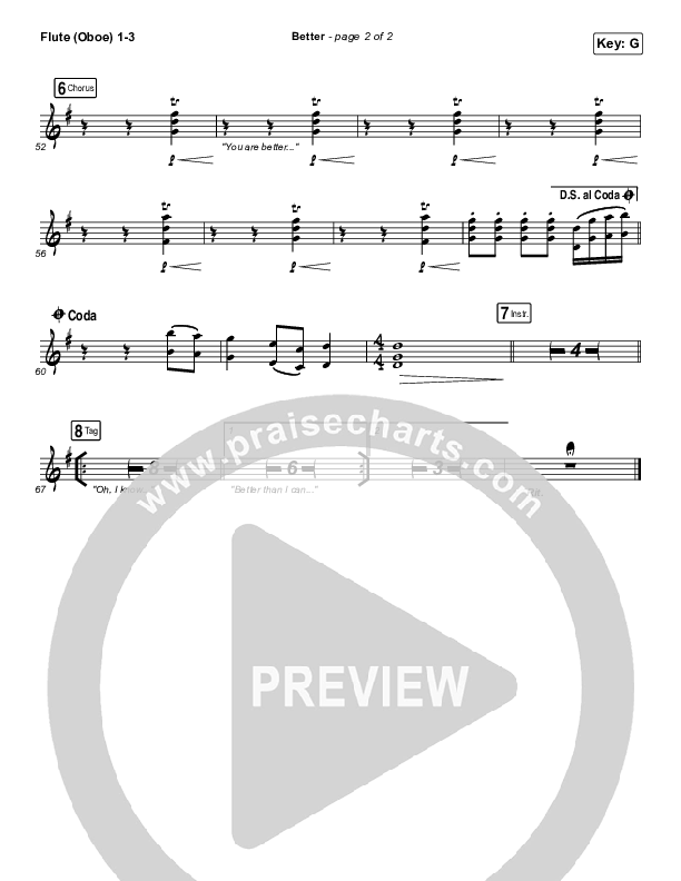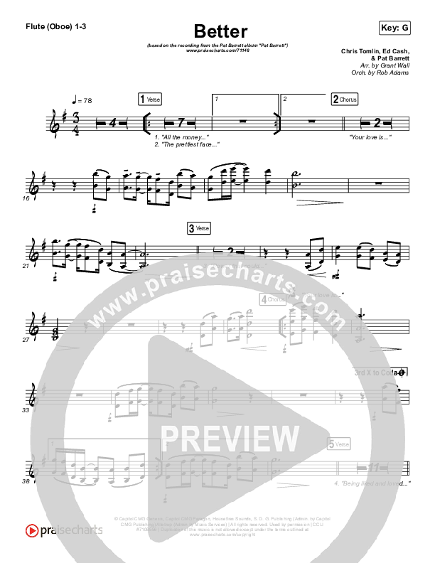 Download the Flute/Oboe sheet music for Better by Pat Barrett, from the album Pat Barrett. This song was arranged by Grant Wall in the key of F, G.