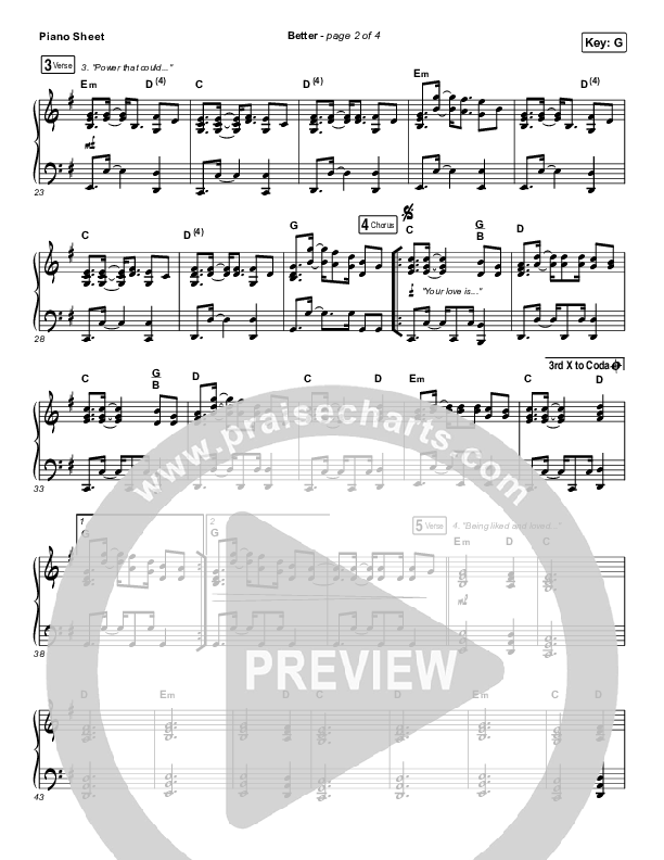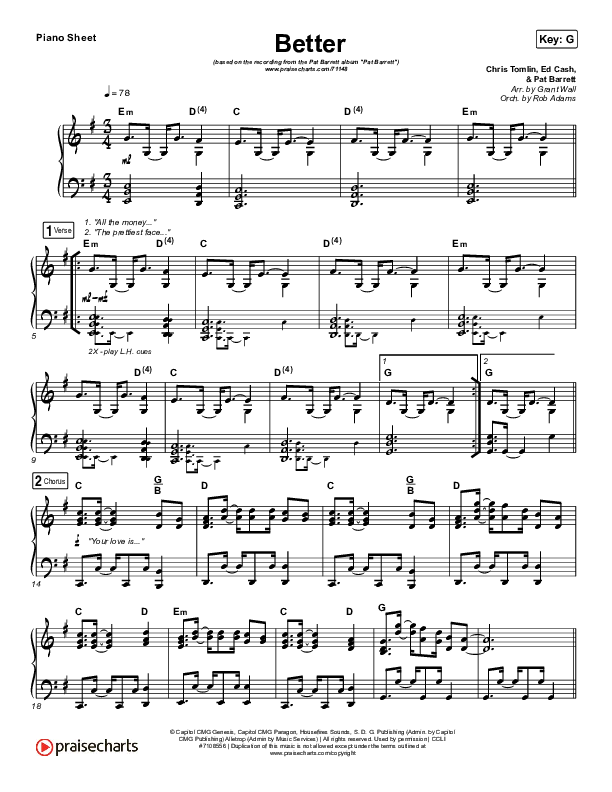 Download the piano sheet for Better by Pat Barrett, from the album Pat Barrett. This song was arranged by Grant Wall in the key of F, G.