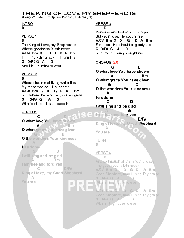 Download the PDF Chord Charts for The King Of Love My Shepherd Is by Todd Wright, from the album The King Of Love My Shepherd Is.