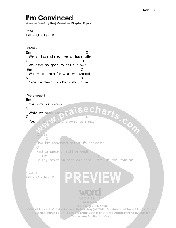 Download the PDF Chord Charts for I'm Convinced by The Church Will Sing, from the album The Church Will Sing. This song was arranged by Word Music in the key of G.