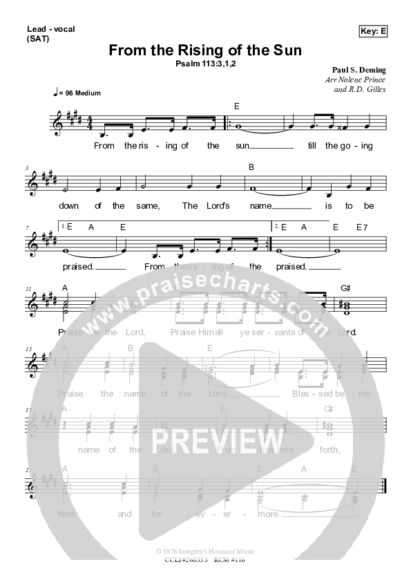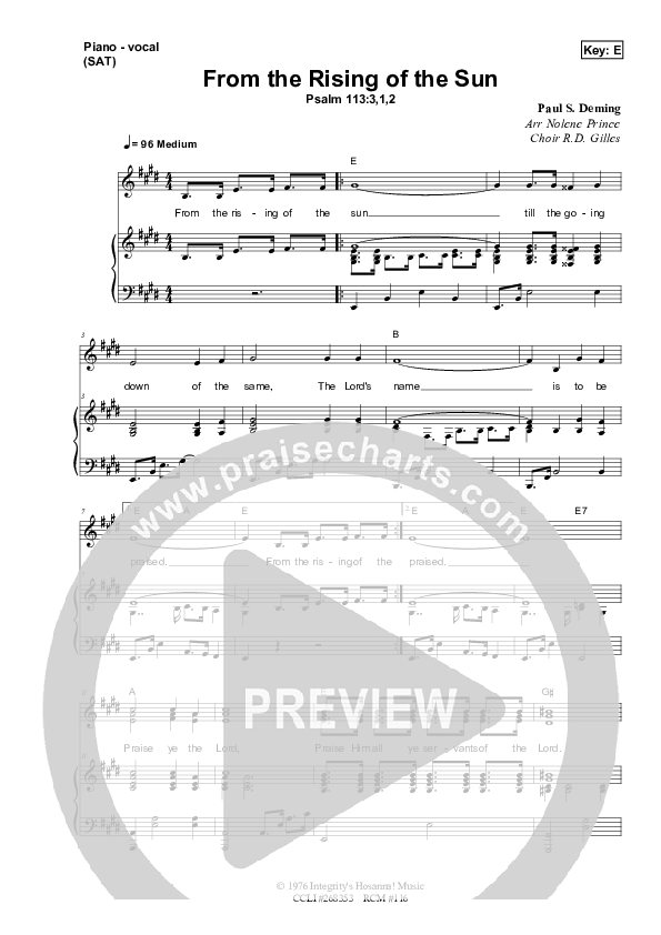Download the sheet music for From The Rising Of The Sun by Dennis Prince / Nolene Prince, from the album Resource Christian Music. This song was arranged by Nolene Prince / R.D. Gilles in the key of E, F.