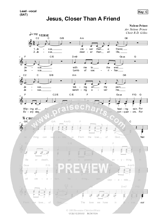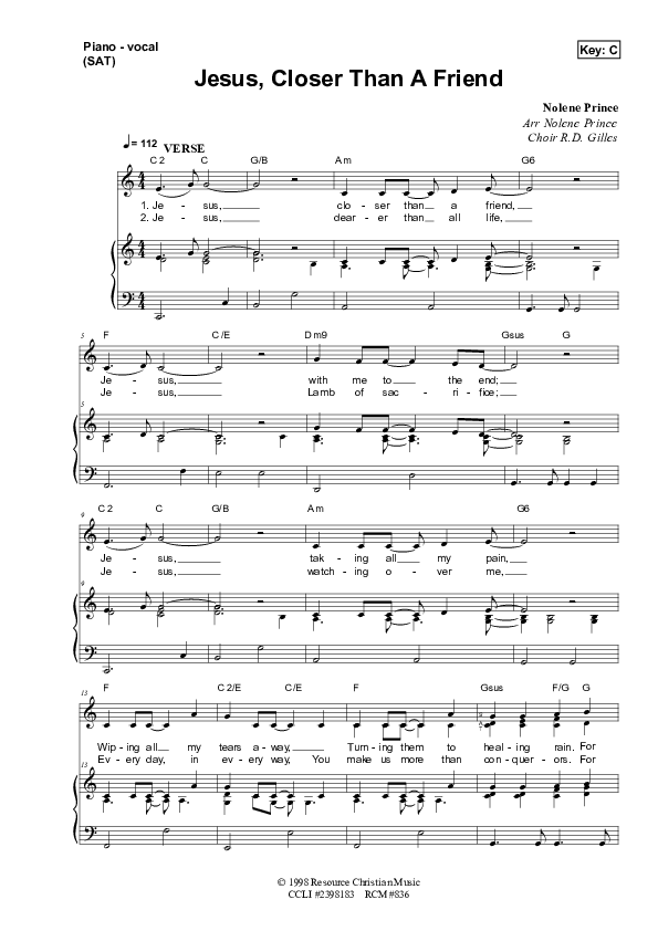Download the sheet music for Jesus Closer Than A Friend by Dennis Prince / Nolene Prince, from the album Resource Christian Music.