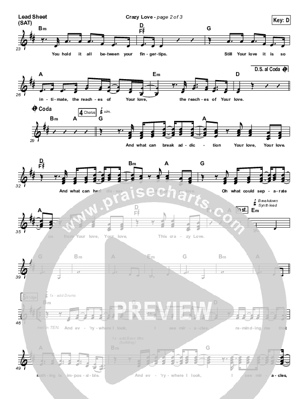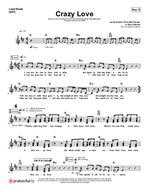 Download the sheet music for Crazy Love by Chris McClarney, from the album Breakthrough. This song was arranged by Dustin Loehrs in the key of C, D.
