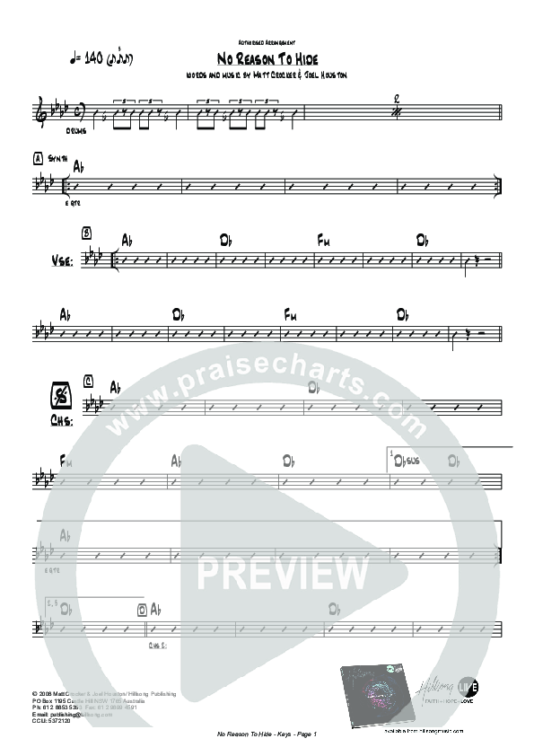 Download the PDF Chord Charts for No Reason To Hide by Hillsong Worship, from the album Faith + Hope + Love. This song was arranged by Hillsong Music in the key of Ab.