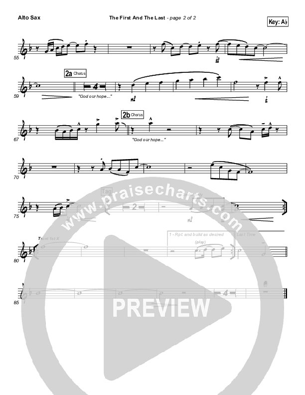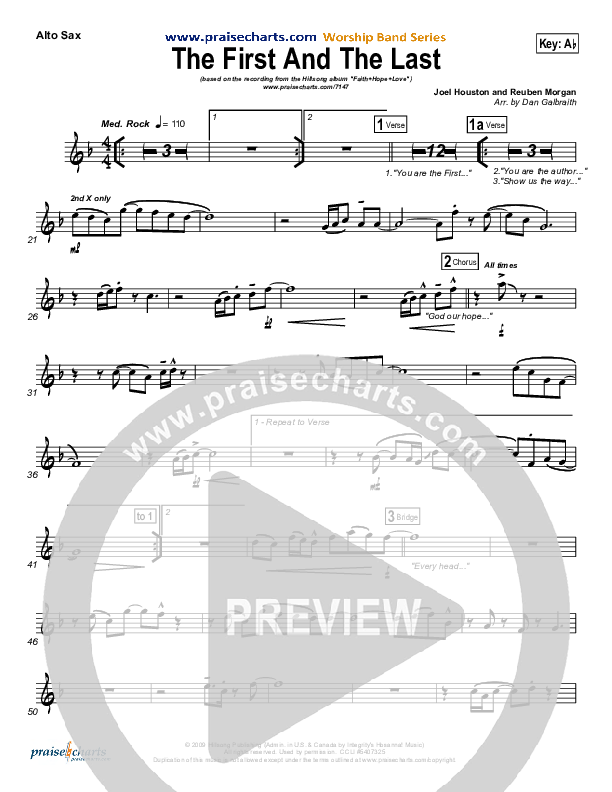 Download the AltoSax sheet music for The First And The Last by Hillsong Worship, from the album Faith + Hope + Love. This song was arranged by Daniel Galbraith in the key of Ab, G.