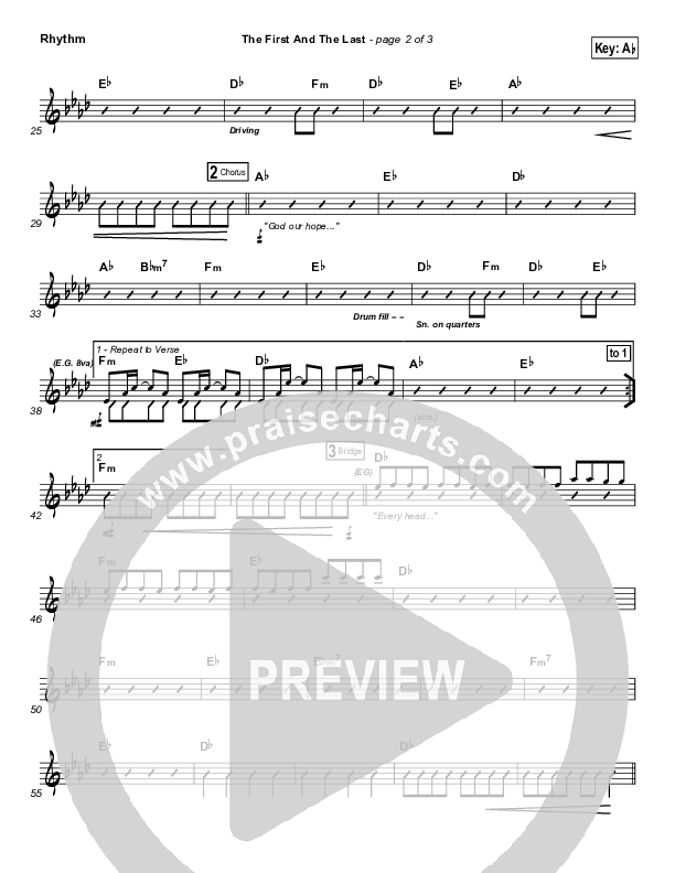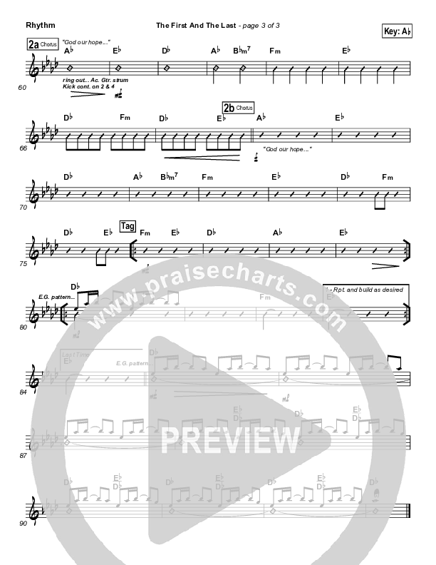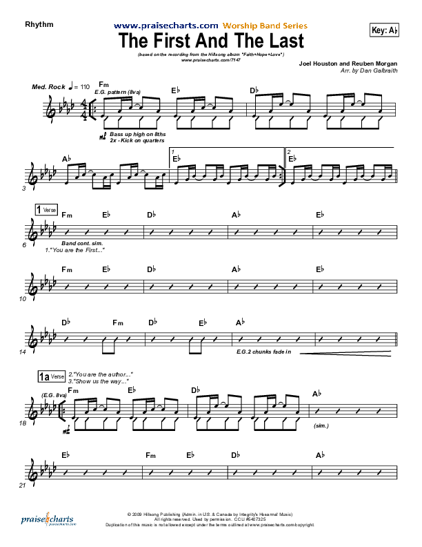 Download the Rhythm Chart for The First And The Last by Hillsong Worship, from the album Faith + Hope + Love. This song was arranged by Daniel Galbraith in the key of Ab, G.