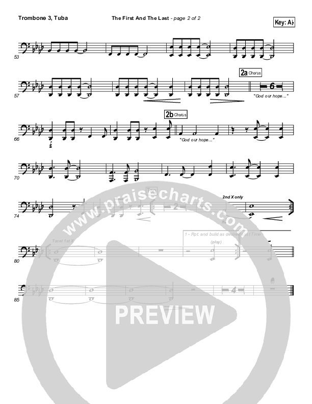 Download the Trombone 3/Tuba sheet music for The First And The Last by Hillsong Worship, from the album Faith + Hope + Love. This song was arranged by Daniel Galbraith in the key of Ab, G.