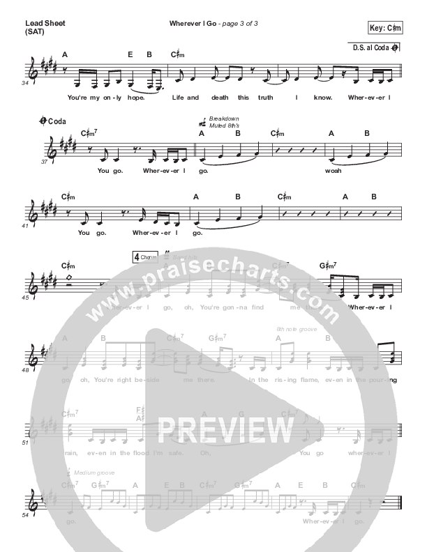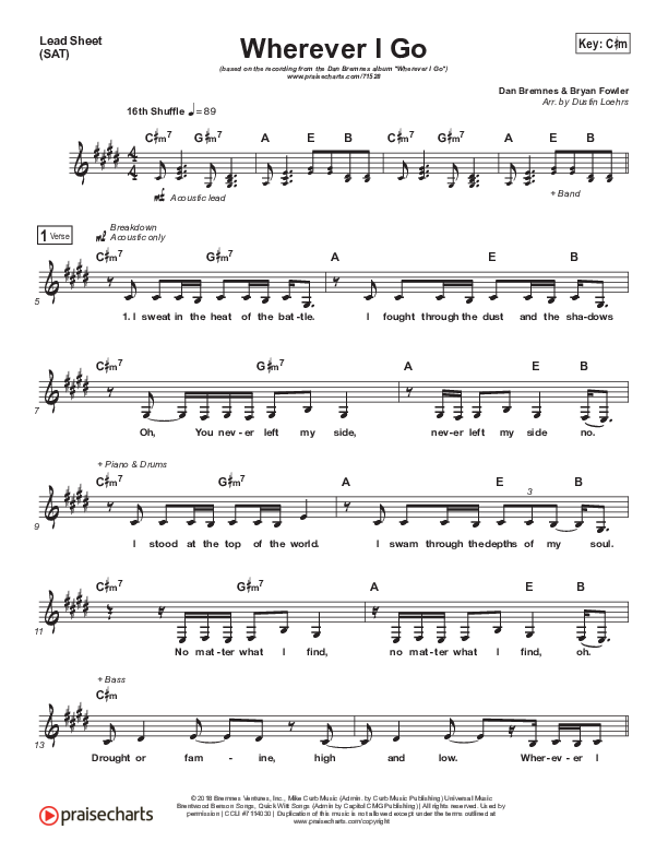 Download the sheet music for Wherever I Go by Dan Bremnes, from the album Wherever I Go. This song was arranged by Dustin Loehrs in the key of C#m, Fm.