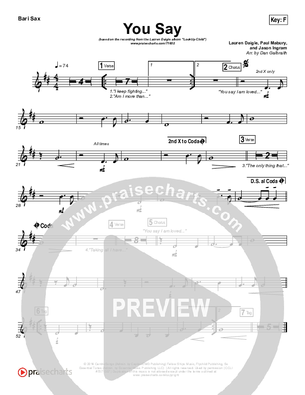 Download the Bari Sax sheet music for You Say by Lauren Daigle, from the album Look Up Child. This song was arranged by Daniel Galbraith in the key of A, F.