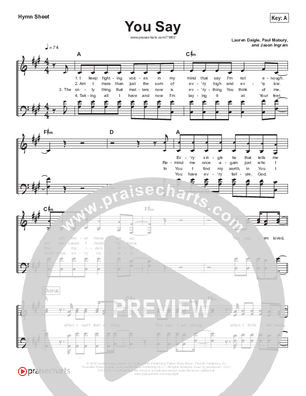 Download the Hymn Sheet for You Say by Lauren Daigle, from the album Look Up Child. This song was arranged by Daniel Galbraith in the key of A, Ab, Bb, F, G.