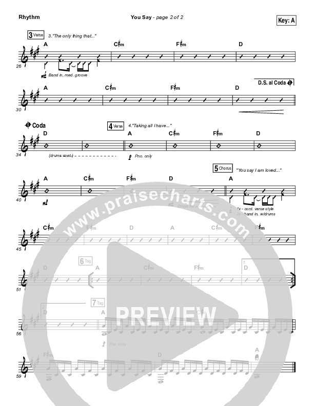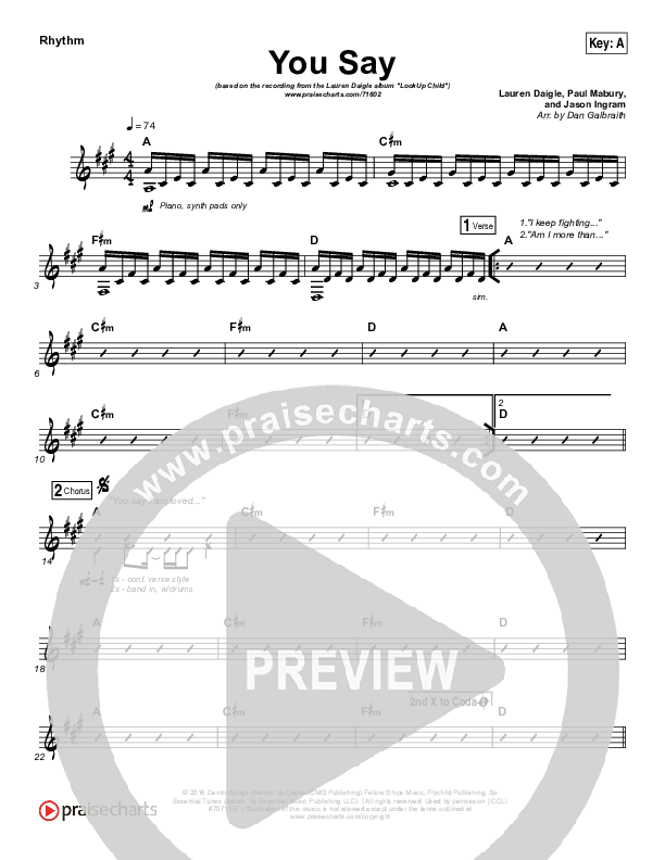 Download the Rhythm Chart for You Say by Lauren Daigle, from the album Look Up Child. This song was arranged by Daniel Galbraith in the key of A, Ab, Bb, F, G.