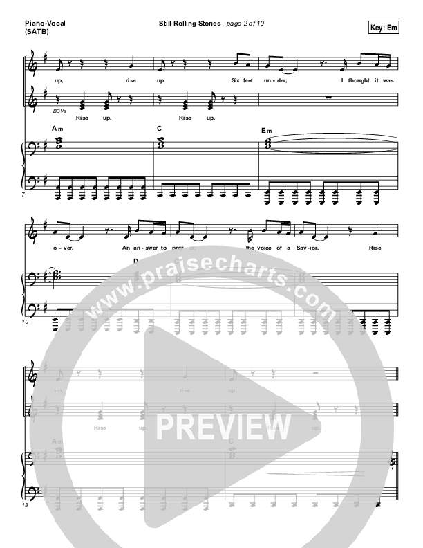Download the sheet music for Still Rolling Stones by Lauren Daigle, from the album Look Up Child. This song was arranged by Ed Kerr / Daniel Galbraith in the key of Em, Fm.