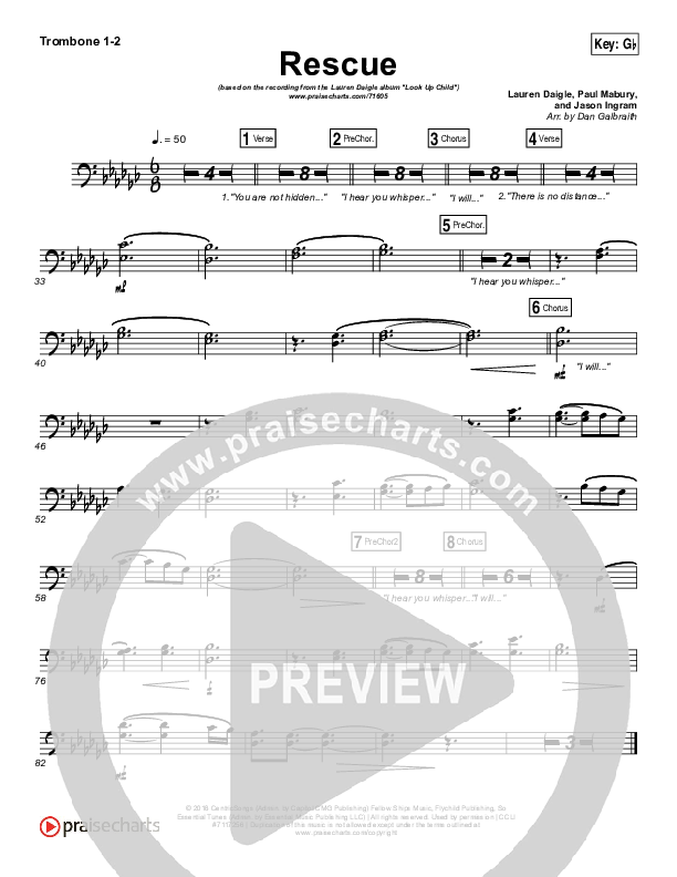 Download the Trombone 1,2 sheet music for Rescue by Lauren Daigle, from the album Look Up Child. This song was arranged by Daniel Galbraith in the key of G, Gb.