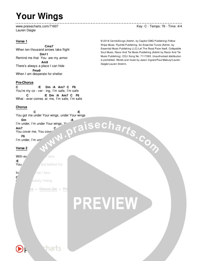 Download the PDF Chord Charts for Your Wings by Lauren Daigle, from the album Look Up Child. This song was arranged by Jeff Moore in the key of C, D.