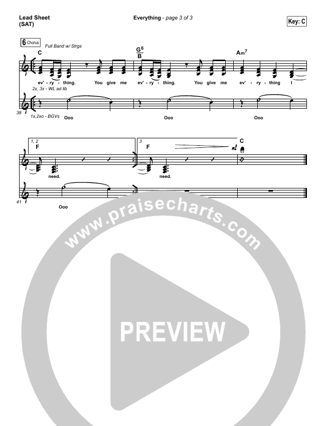 Download the sheet music for Everything by Lauren Daigle, from the album Look Up Child. This song was arranged by Jeff Moore / Daniel Galbraith in the key of C, D.