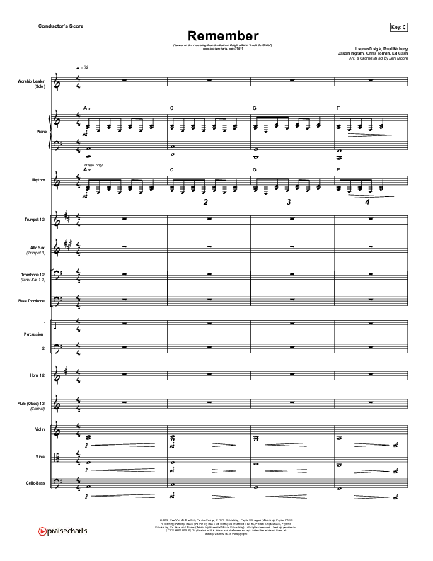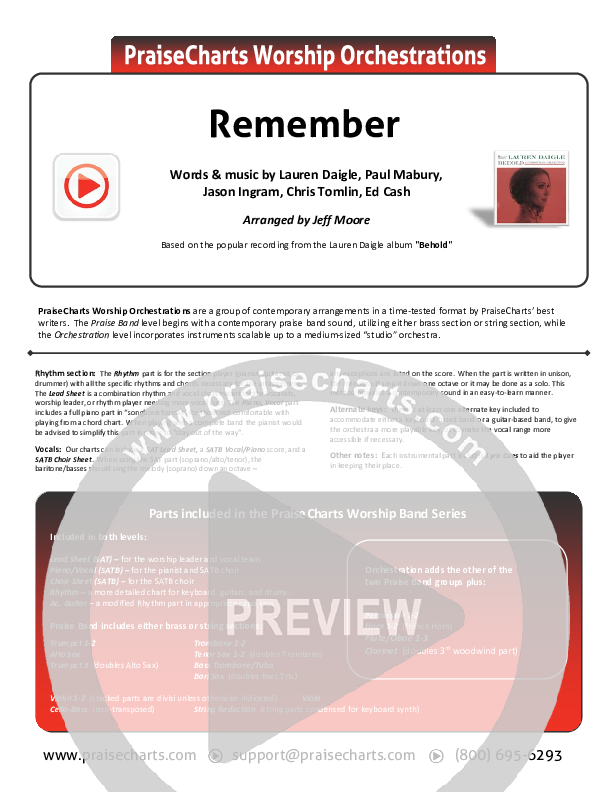 Download the Orchestration for Remember by Lauren Daigle, from the album Look Up Child. This song was arranged by Jeff Moore in the key of C, D.
