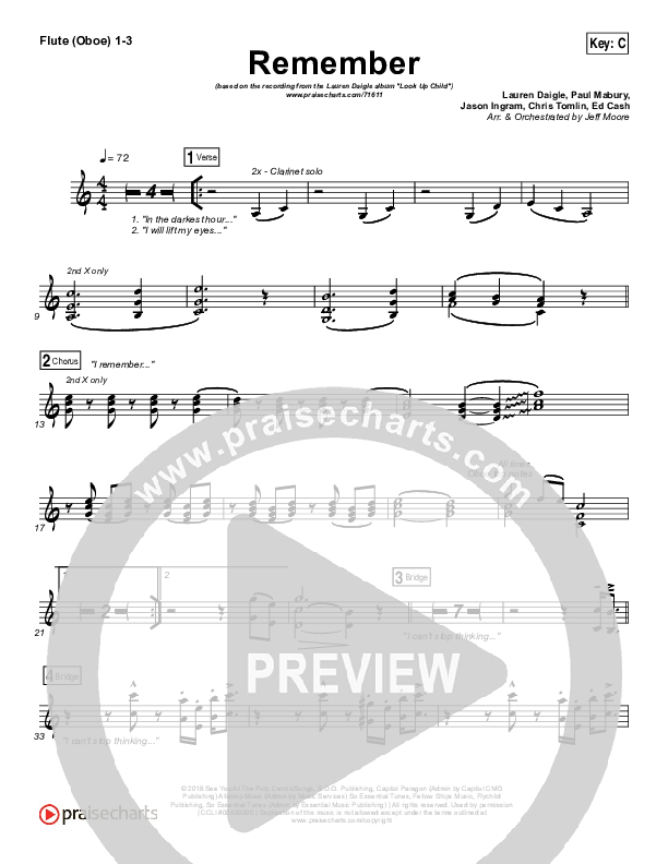 Download the Orchestration wind parts for Remember by Lauren Daigle, from the album Look Up Child. This song was arranged by Jeff Moore in the key of C, D.