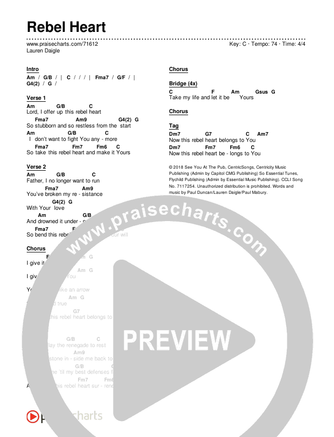 Download the PDF Chord Charts for Rebel Heart by Lauren Daigle, from the album Look Up Child. This song was arranged by Daniel Galbraith in the key of C, D.