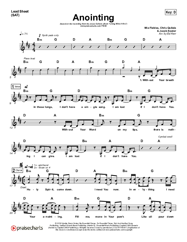 Download the sheet music for Anointing by Jesus Culture / Chris Quilala, from the album Living With A Fire. This song was arranged by Ed Kerr in the key of C, D.
