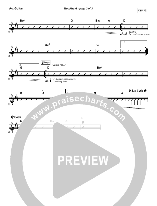 Download the Rhythm Chart for Not Afraid by Jesus Culture / Kim Walker-Smith, from the album Living With A Fire. This song was arranged by Ed Kerr / Daniel Galbraith in the key of G, Gb.