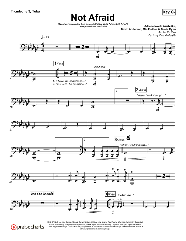 Download the Trombone 3/Tuba sheet music for Not Afraid by Jesus Culture / Kim Walker-Smith, from the album Living With A Fire. This song was arranged by Ed Kerr / Daniel Galbraith in the key of G, Gb.