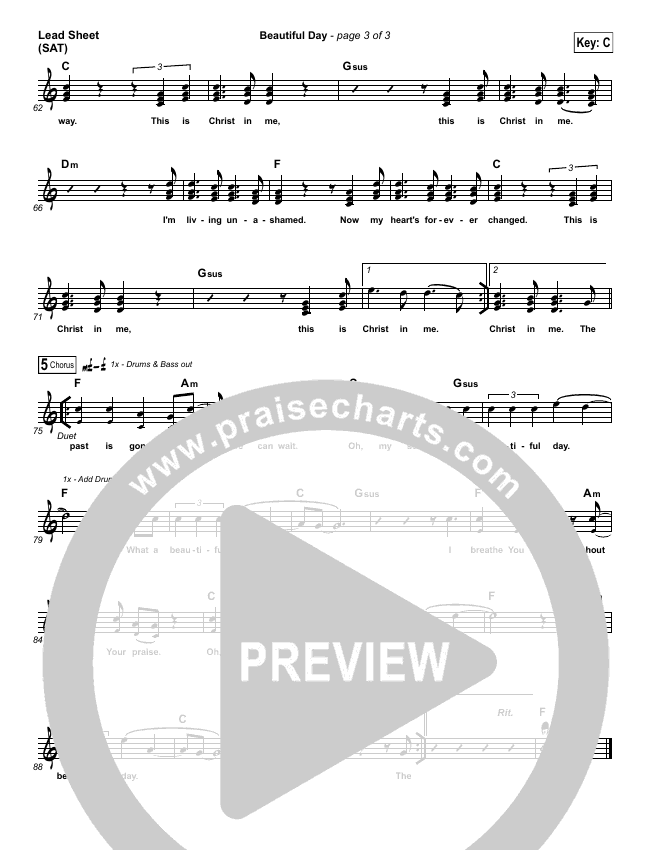 Download the sheet music for Beautiful Day by Jesus Culture / Derek Johnson, from the album Living With A Fire. This song was arranged by Ed Kerr in the key of B, C.
