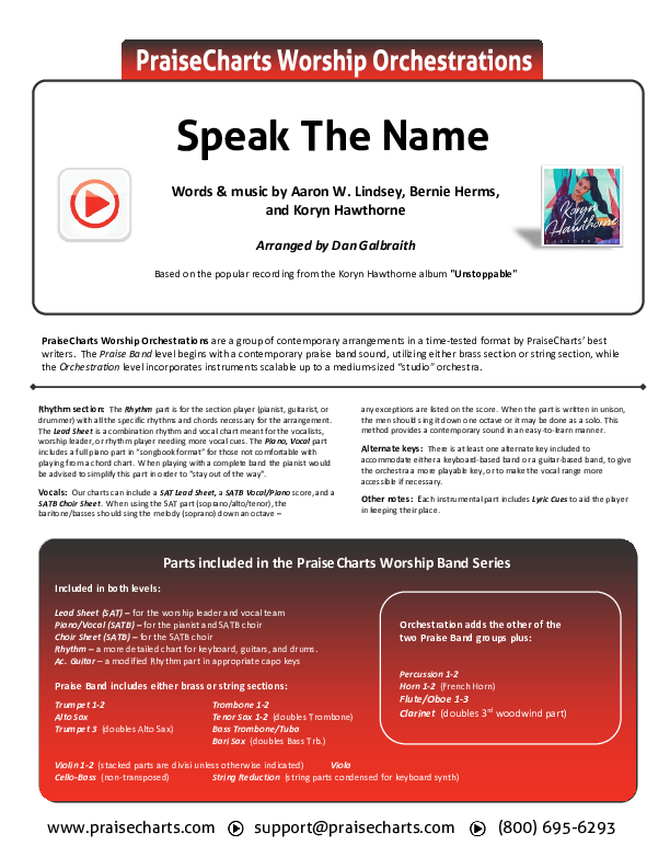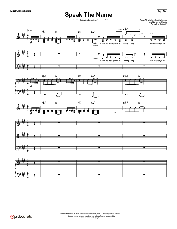Download the Orchestration for Speak The Name by Koryn Hawthorne / Natalie Grant, from the album Unstoppable. This song was arranged by Daniel Galbraith in the key of F#m, Fm.