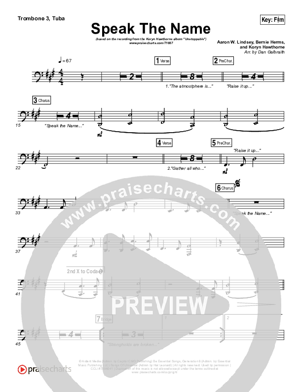 Download the Trombone 3/Tuba sheet music for Speak The Name by Koryn Hawthorne / Natalie Grant, from the album Unstoppable. This song was arranged by Daniel Galbraith in the key of F#m, Fm.