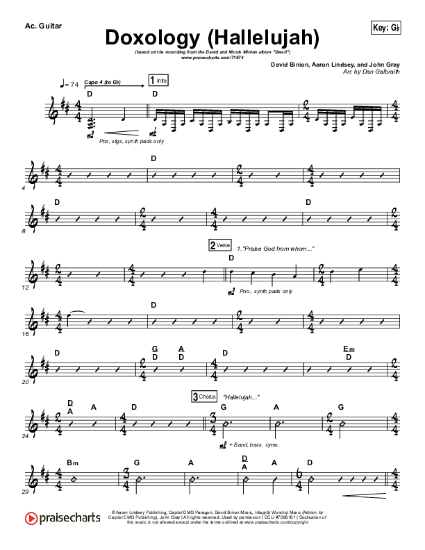Download the Acoustic Guitar sheet music for Doxology (Hallelujah) by David & Nicole Binion / Tasha Cobbs Leonard, from the album Dwell: A Live Worship Experience. This song was arranged by Daniel Galbraith in the key of G, Gb.