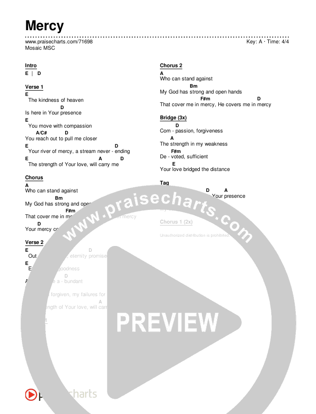 Download the PDF Chord Charts for Mercy by Mosaic MSC, from the album Heaven.