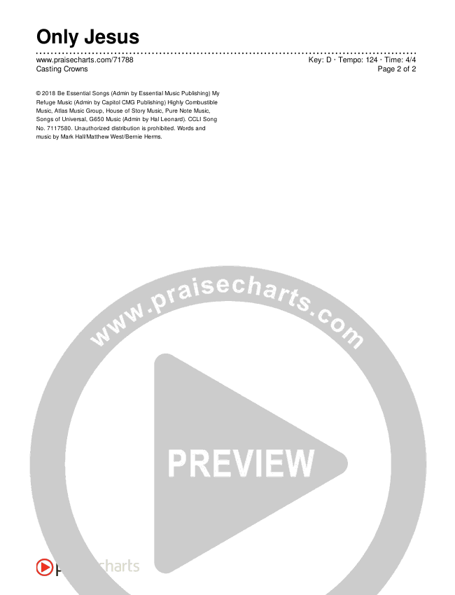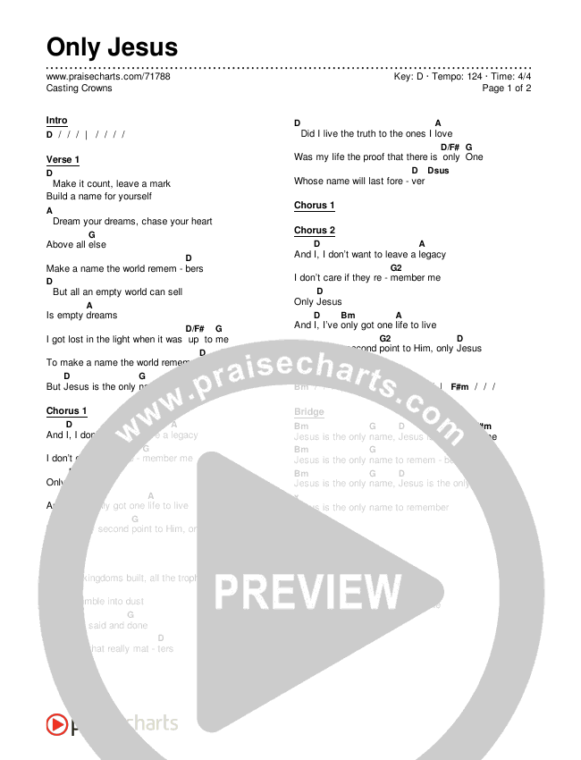 Download the PDF Chord Charts for Only Jesus by Casting Crowns, from the album Only Jesus - EP. This song was arranged by Daniel Galbraith in the key of D, Eb.