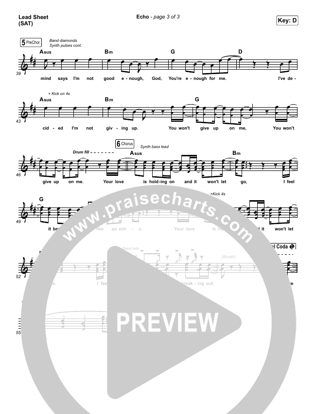 Download the sheet music for Echo by Elevation Worship / Tauren Wells, from the album Hallelujah Here Below. This song was arranged by Daniel Galbraith in the key of C, D.
