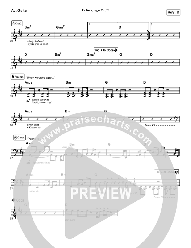 Download the Acoustic Guitar sheet music for Echo by Elevation Worship / Tauren Wells, from the album Hallelujah Here Below. This song was arranged by Daniel Galbraith in the key of C, D.