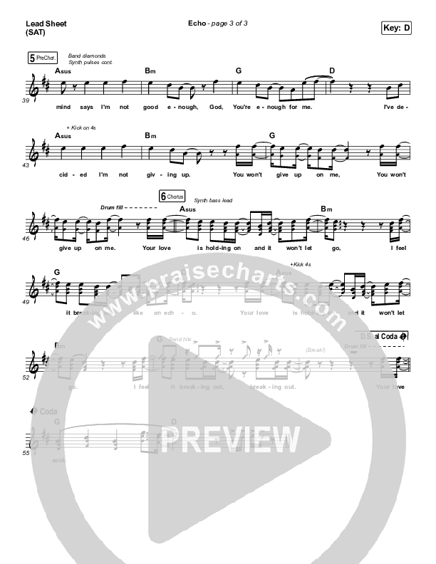 Download the sheet music for Echo by Elevation Worship / Tauren Wells, from the album Hallelujah Here Below. This song was arranged by Daniel Galbraith in the key of C, D.