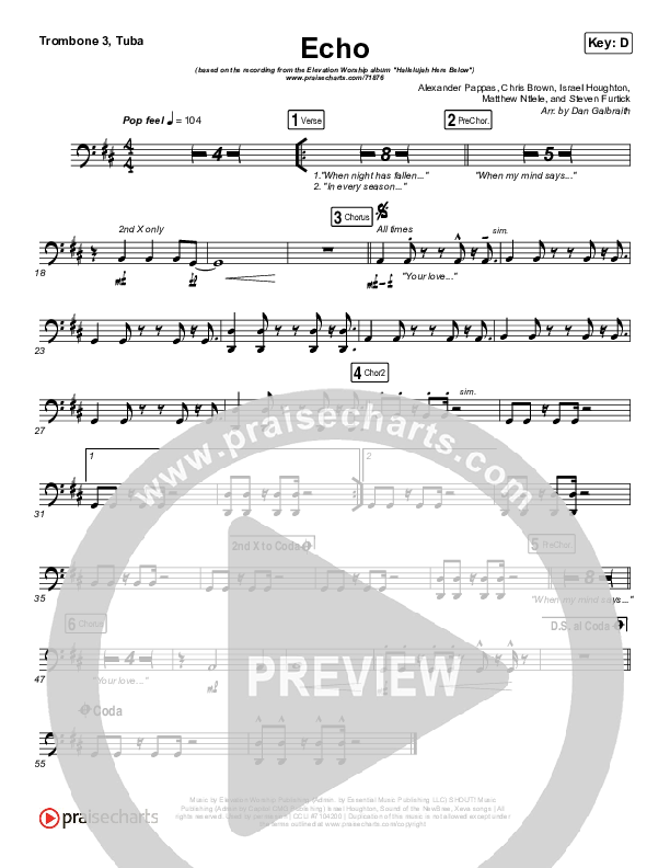 Download the Trombone 3/Tuba sheet music for Echo by Elevation Worship / Tauren Wells, from the album Hallelujah Here Below. This song was arranged by Daniel Galbraith in the key of C, D.
