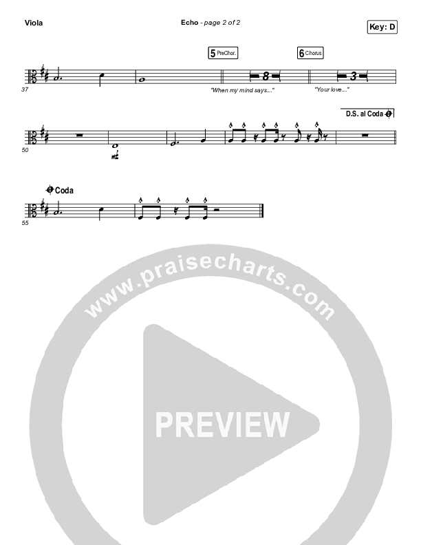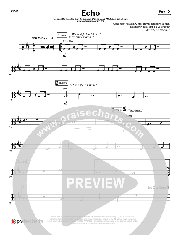 Download the Viola sheet music for Echo by Elevation Worship / Tauren Wells, from the album Hallelujah Here Below. This song was arranged by Daniel Galbraith in the key of C, D.