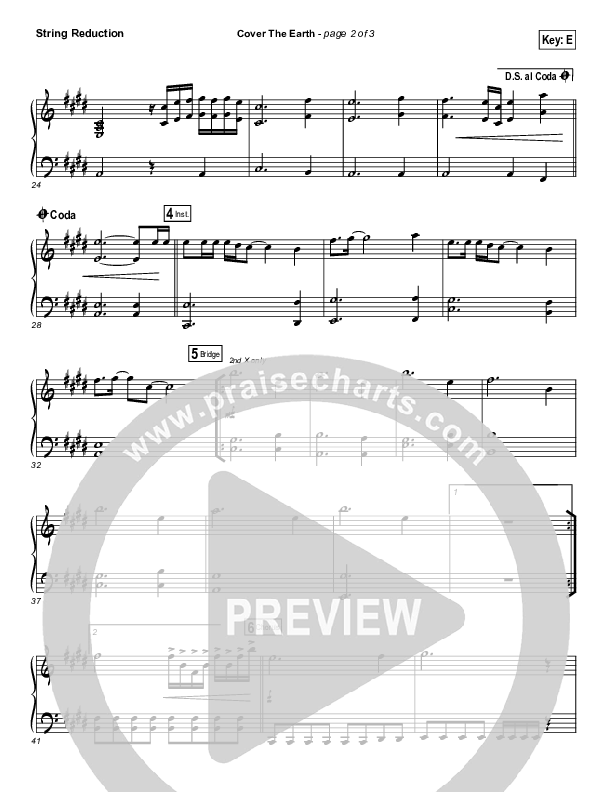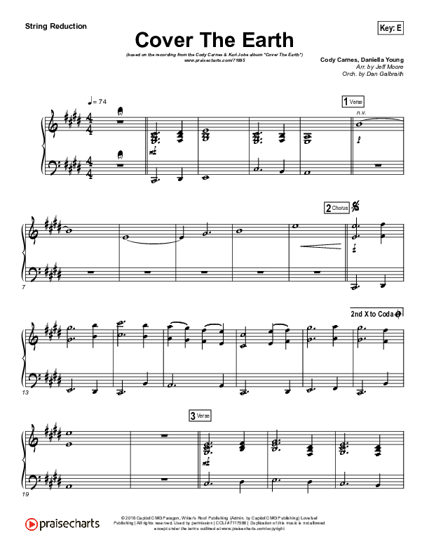 Download the String Reduction sheet music for Cover The Earth by Cody Carnes / Kari Jobe, from the album Cover The Earth. This song was arranged by Jeff Moore / Daniel Galbraith in the key of E, Eb.